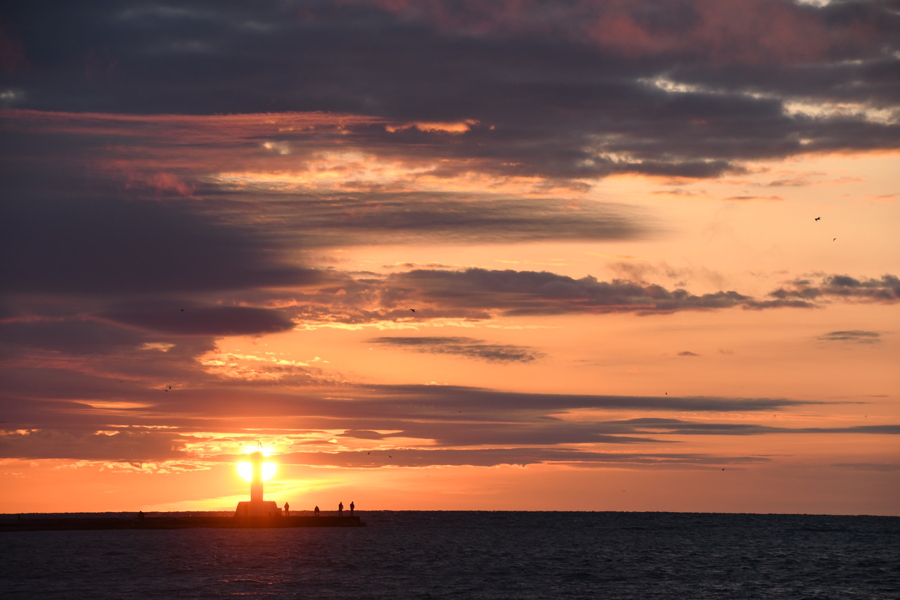 The Sun rises on fishermen and seagulls, gathered by the harbor light, flashing its constant message, "This is the way home".  Waukegan Harbor & Marina, Waukegan, Illinois.